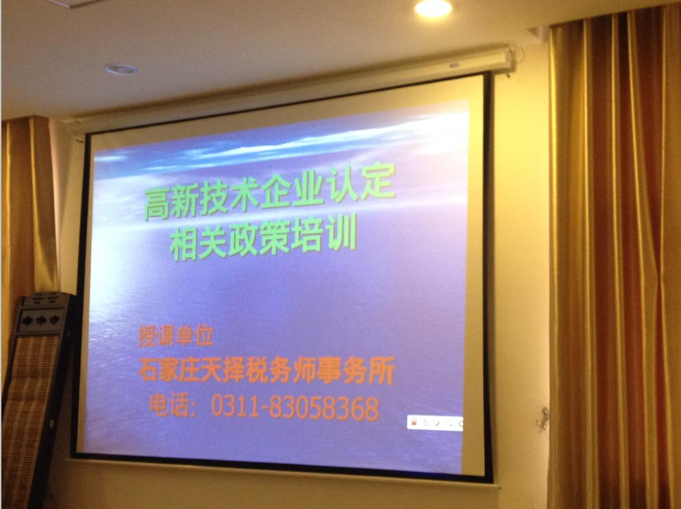 2015年1月14日,成安縣科技局召開了高新技術企業(yè)認定培訓會,培訓會由我公司張勤總經(jīng)理親臨現(xiàn)場授課,針對企業(yè)如何申報高企、高企優(yōu)惠政策、企業(yè)研發(fā)費用加計扣除等方面進行了詳細的講解。會上免費發(fā)放了天擇稅務師事務所印制的“高新技術企業(yè)認定方略”、“稅收政策輯要”等資料。